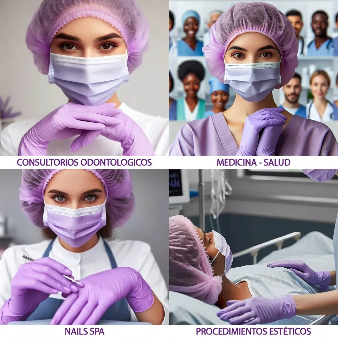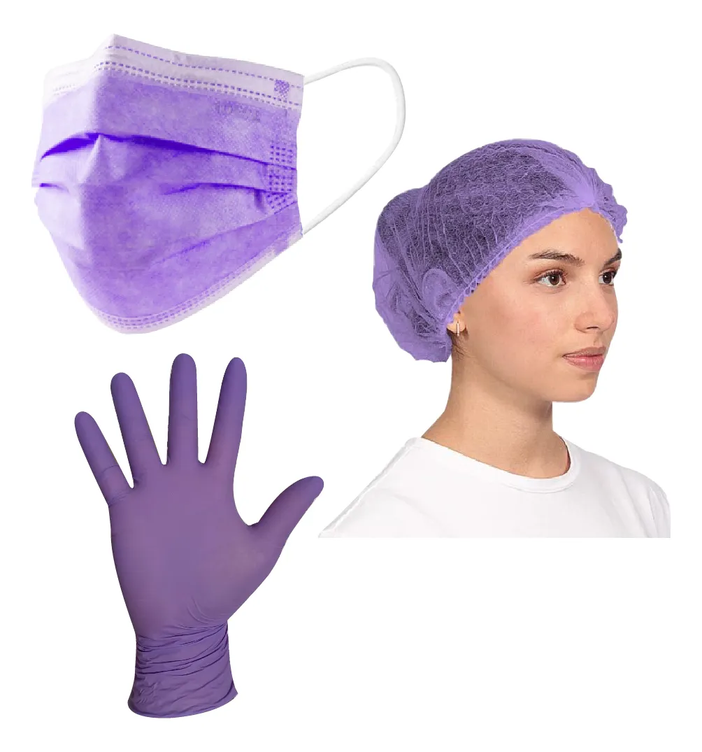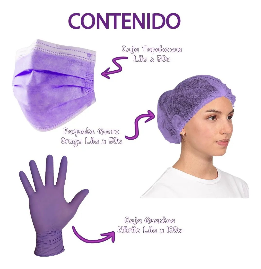 Kit completo color lila: caja tapabocas x50 + paquete gorro oruga x50 + caja guantes nitrilo x100.